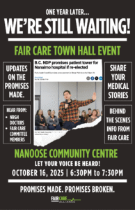 Last year David Eby promised to bring a new hospital tower and catheterization lab to the Central-Island community. One year later, there has been no engagement to fulfill his promises.